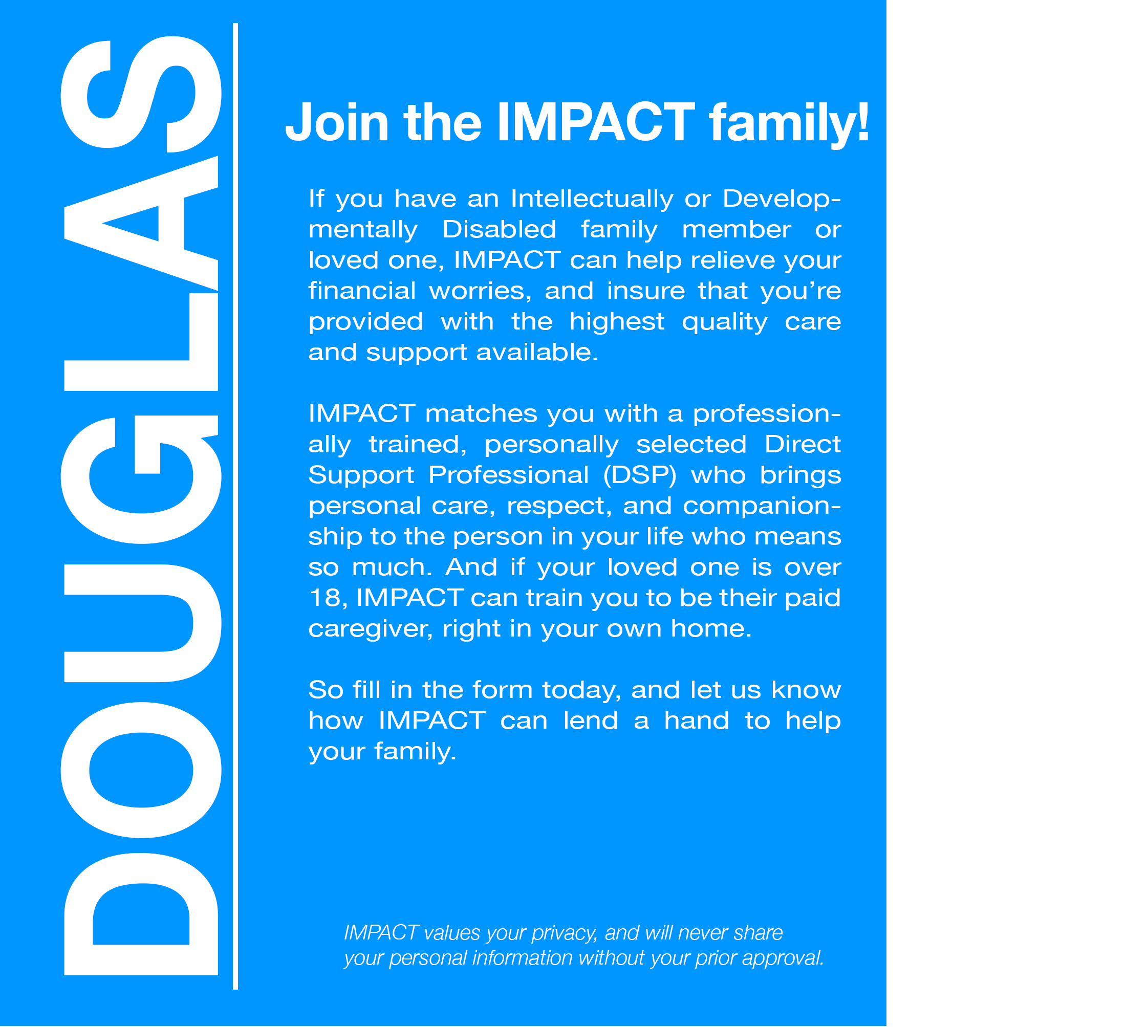 IMPACT matches you with a professionally trained, personally selected Direct Support Professional (DSP) who brings personal care, respect, and companionship to the person in your life who means so much. And if your loved one is over 18, IMPACT can train you to be their paid caregiver, right in your own home.